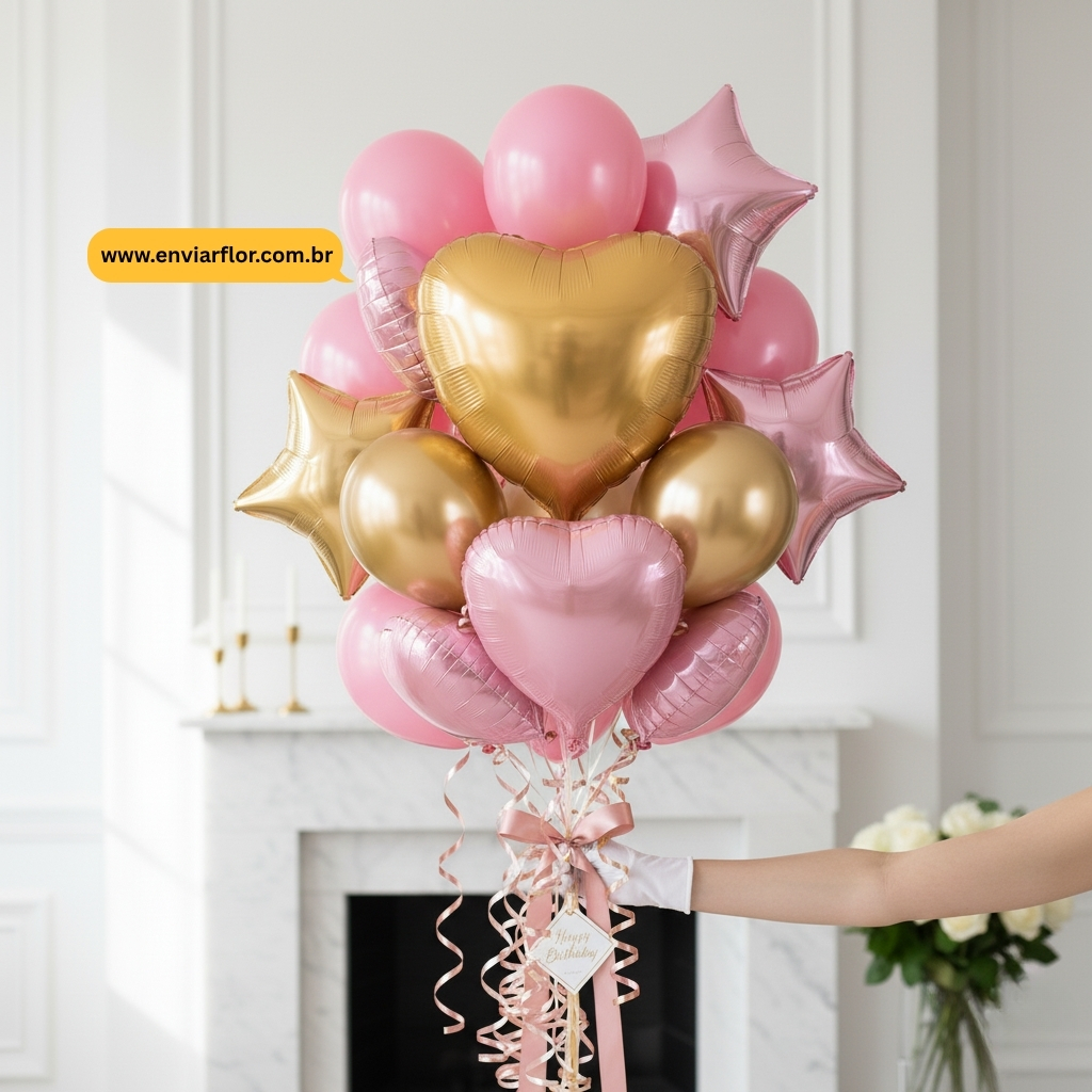 Essa combinação encontra o equilíbrio perfeito entre charme feminino e opulência. Balões rosa e dourados transmitem uma sensação festiva sem serem exagerados, o que os torna incrivelmente populares para diversas ocasiões.